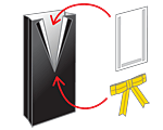 隙間の開いている襟の部分に適当な紙を両面テープで内側から貼付け、襟の下部分にリボンやネクタイの飾りを付けます。