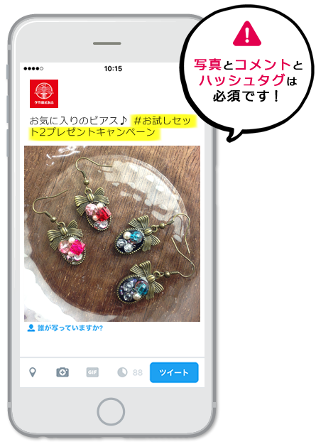 タカ印紙製品公式Twitterアカウント「@sasagawa_taka」をフォローし、お気に入りのピアスやアクセサリーの画像とコメントとハッシュタグ「#お試しセット2プレゼントキャンペーン」を付けてツイートすると応募完了とさせていただきます。